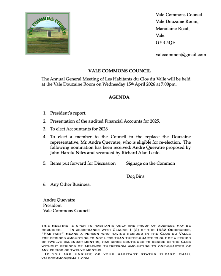 Notice has been given that the annual meeting of Les Habitants du Clos du Valle is to be held tomorrow night at the Vale Douzaine room starting at 7pm.